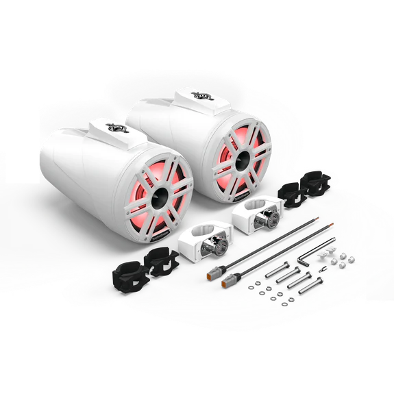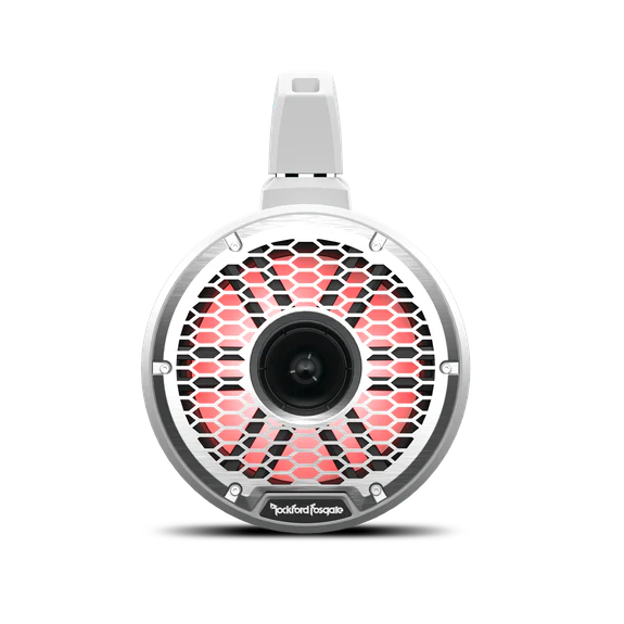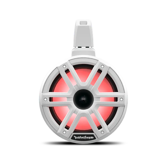 The M2WL-8H Color Optix™ 8" 2-way speakers deliver loud, clear, accurate sound, and light the way for your fresh or salt-water journey! Exceptional clarity and distance is possible with the built-in loaded horn, designed to project music to the skier or wakeboarder. The M2 can be installed using direct mount or a clamp mount method that provides 360-degree rotation on wake tower bar sizes from 1.5” to 3”. The M2 includes stainless-steel and white “sport” grille inserts and features a rear illuminated 3DIL™ medallion that can be rotated 360-degrees for proper orientation.  The speakers connect with the Rockford Fosgate Color Optix™ Controller (sold separately) and RF Connect App, allowing you to customize both front speaker and rear medallion with your own color patterns.